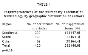 We observed no significant differences among specialties (of the authors) in the terms used. Pulmonologists used inappropriate terms to describe pulmonary auscultation as frequently as did non-pulmonologists. In addition, the use of inappropriate terms occurred in all regions of the country. The regions were equivalent in terms of the percentage of inappropriate pulmonary auscultation terms used.