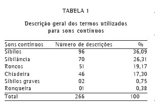 Quanto aos ruídos contínuos, a situação é menos alarmante. Foram descritos seis termos diferentes em oposição aos dois termos propostos pela ILSA: sibilos e roncos. Os estudos anteriores demonstraram resultados semelhantes.(10-11) A menor inadequação dos sons contínuos, em relação aos descontínuos, provavelmente possa se fundamentar pela relativa facilidade de distinguí-los. Os roncos são sons graves (de baixa freqüência) e os sibilos são agudos (alta freqüência).