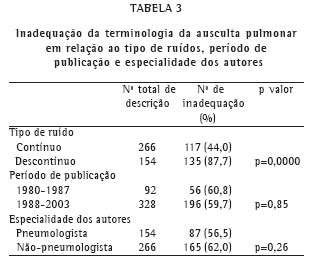 A Tabela 3 mostra a inadequação da terminologia utilizada para o relato da ausculta pulmonar em relação aos tipos de ruídos, período de publicação e especialidade dos autores. Foi observada uma maior porcentagem de inadequações dos termos empregados para a descrição dos ruídos descontínuos em relação aos contínuos (87,7% versus 44%, p = 0,0000). Comparando-se os períodos de 1980 a 1987 e 1988 a 2003, não houve diferença significativa em relação à inadequação do uso dos termos para descrever ruídos adventícios (60,8% versus 59,7%, p = 0,85).