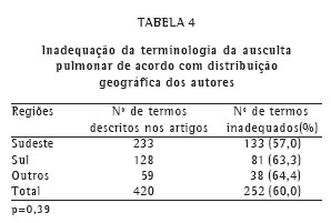 Na Tabela 4 verifica-se a avaliação da inadequação de termos por Estados federativos. Considerando-se o número de publicações, os Estados foram agrupados em três regiões: Sudeste (SP, RJ, MG), Sul (PR, SC, RS) e Outros (SE, GO, MT, MS, BA, PE, CE, MA, AM). Não houve diferença significativa entre as regiões quanto à inadequação da aplicação dos termos dos ruídos adventícios da ausculta pulmonar (p = 0,39).