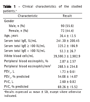 In our study, no statistically significant differences were found between the patients with high and low IgE levels regarding the baseline values of FEV1, FVC and FEF25-75%. In a study involving adult patients with asthma in Europe, IgE was found to be a strong predictor of moderate-to-severe asthma.(22) In another study, higher total IgE levels were shown to be associated with the degree of asthma severity among younger subjects with difficult-to-treat or severe asthma.(23) Recently, other authors have reported that, among patients with asthma, mean FEV1 is significantly lower in those with high IgE levels than in those with low IgE levels.(24) Among our patients, baseline FEV1 was 53.9 ± 14.0% and 54.5±14.3% of predicted, respectively, in those with high and low total serum IgE levels (p = 0.79). Unlike the asthma subjects recruited in some other studies, our patients were not in remission.