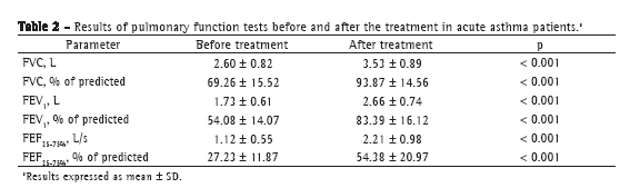 Data are expressed as mean ± SD. The Kolmogorov-Smirnov test was used for the distribution of quantitative variables. Mean ± SD values of pulmonary function tests (FEV1 and FVC) prior to and after the treatment were calculated, and p values were compared by means of Student's t-test for paired and unpaired data. Comparisons between the groups were evaluated using the Mann-Whitney U-test or the Wilcoxon signed-rank test, when appropriate. Values of p ≤ 0.05 were considered significant. Statistical analyses were performed using the Statistical Package for the Social Sciences, version 15.0 for Windows (SPSS Inc., Chicago, IL, USA).