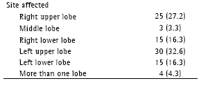 Results Of the 92 patients studied, 65 (70.6%) were male and 27 (29.4%) were female. The mean age was 63.2 years (median, 67 years). Table 1 shows that pulmonary lobectomy (76.1%) was the surgical procedure most commonly used, followed by pneumonectomy, conservative segmentectomy, bilobectomy, and wedge resection. The predominant histological type was adenocarcinoma (in 38% of the cases), followed by epidermoid carcinoma (in 33.7%). Most of the neoplasms were located in the left upper lobe in 32.6% of the patients and in the right upper lobe in 27.5% of the patients.