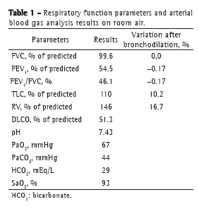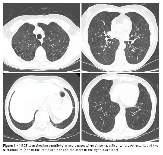 An HRCT scan showed centrilobular and paraseptal emphysema, cylindrical bronchiectasis (predominantly central and upper lobe bronchiectasis), and two micronodules of 3 mm and 4 mm in diameter, respectively, in the right lower lobe and in the left lower lobe (Figure 1). Immunoglobulin quantification showed an increase in total IgE levels (671 IU/mL), with no other abnormalities. Alpha-1 antitrypsin levels were normal. Respiratory function test results revealed moderately severe obstructive lung disease accompanied by inflation, moderately reduced alveolar-capillary diffusion, and mild type I respiratory failure. The patient had a negative bronchodilator response (Table 1). Her electrocardiogram was normal, and the results of the microbiological study of sputum were negative.