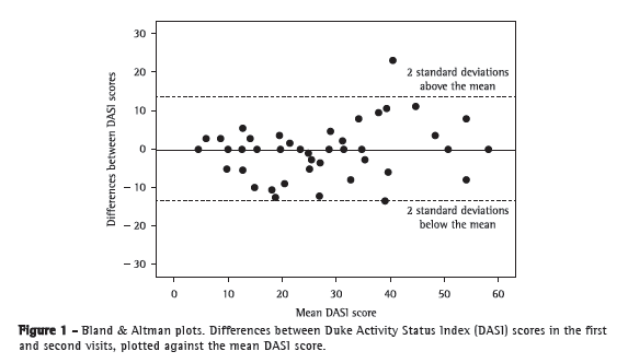 Table 2 shows the mean DASI scores and the estimated VO2 as assessed by the same investigator at V1 and V2. There were no statistically significant differences between the values. The mean DASI scores and the mean estimated VO2 were, respectively, 23.9 ± 14.9 mL  kg−1  min−1 and 19.9 ± 6.4 mL  kg−1  min−1, as assessed by the second investigator at V1, and were not significantly different from the values obtained by the first investigator. Table 2 shows the ICCs for intraobserver reproducibility of the DASI score and the estimated VO2, the ICCs for both variables being 0.95 (p < 0.001) and therefore indicating excellent reproducibility. The ICC for interobserver reproducibility was 0.90 (95% CI: 0.81-0.95; p < 0.001).