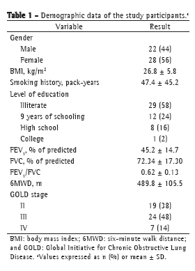 For the assessment of reproducibility, we selected 50 patients, whose mean age was 62.3 years. Of those 50 patients, 56% were female. Most had moderate obstructive lung disease, were normal weight, and were illiterate (Table 1).