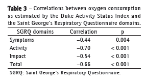 As can be seen in Table 3, the correlations between VO2 (as estimated by the DASI) and the SGRQ domains were all negative and statistically significant. The DASI correlated best with the SGRQ activity domain and the total SGRQ score.