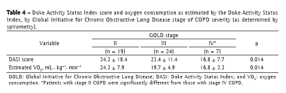 Table 4 shows a comparison of the GOLD stages of COPD severity with the DASI scores and the estimated VO2. Greater disease severity translated to lower DASI scores.