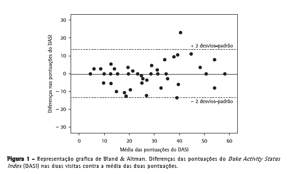 Na Figura 1, está demonstrada a representação gráfica de Bland  Altman da variabilidade individual do escore do DASI entre V1 e V2.