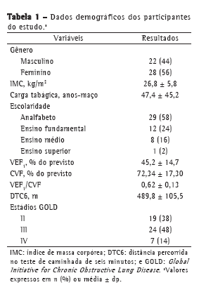 Foram incluídos na fase de reprodutibilidade 50 pacientes, cuja média de idade foi de 62,3 anos, sendo 56% do gênero feminino. A maioria tinha distúrbio ventilatório obstrutivo moderado, era eutrófica e analfabeta (Tabela 1).