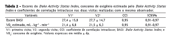 Na Tabela 2, estão demonstradas as médias do escore do DASI e o VO2 estimado obtidos pelo mesmo investigador na V1 e V2. Não houve diferenças estatisticamente significantes entre os valores. As médias do escore do DASI e do VO2 estimado foram de, respectivamente, 23,9 ± 14,9 mL  kg−1  min−1 e 19,9 ± 6,4 mL  kg−1  min−1, avaliados pelo segundo investigador na V1, e não foram significantemente diferentes dos valores obtidos pelo primeiro investigador. Na Tabela 2, também estão demonstrados os valores de CCI intraobservador para o escore do DASI e o VO2 estimado, com excelente reprodutibilidade, alcançando valor de 0,95 (p < 0,001) para ambas as variáveis. Na análise interobservador, o CCI foi de 0,90 (IC95%: 0,81-0,95; p < 0,001).
