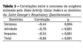 Na Tabela 3, estão descritas as correlações entre o VO2 estimado pelo DASI e os domínios do SGRQ, as quais foram negativas e estatisticamente significantes com todos os domínios do SGRQ. As melhores correlações ocorreram com o domínio atividade e a pontuação total do SGRQ.