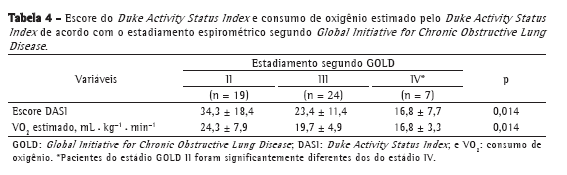 Na Tabela 4, está demonstrada a comparação da gravidade da doença segundo os critérios da GOLD com a pontuação do DASI e VO2 estimado. Quanto maior a gravidade da doença, menores foram os escores do DASI.