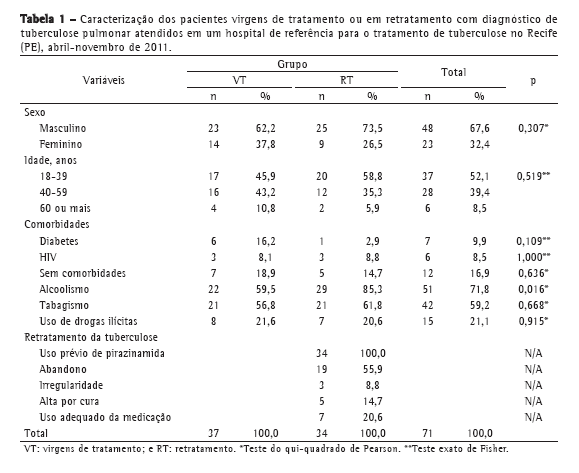 Na Tabela 1, apresentam-se as características dos pesquisados de forma comparativa entre os grupos, com os seguintes destaques: no grupo total, a maioria (67,6%) era do sexo masculino; um pouco mais da metade (52,1%) tinha de 18 a 39 anos; as comorbidades alcoolismo e tabagismo foram as mais frequentes (71,8% e 59,2%, respectivamente), com a ressalva de que um mesmo paciente poderia apresentar simultaneamente mais de uma comorbidade. No grupo RT, todos os pacientes relataram ter feito uso prévio do fármaco pirazinamida (100,0%); 55,9% admitiram ter abandonado o tratamento; 20,6% relataram ter utilizado o medicamento corretamente; 14,7% relataram alta por cura; e os 8,8% restantes do grupo admitiram ter feito uso irregular do medicamento. Para a margem de erro fixada, alcoolismo foi a única variável com diferença significativa entre os grupos RT e VT (85,3% vs. 59,5%; p = 0,016).
