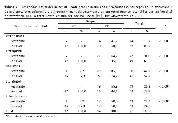 MétodosEstudo prospectivo, descritivo, realizado no período entre abril e novembro de 2011, num hospital de referência para o tratamento de tuberculose no estado de Pernambuco. Foram incluídos pacientes com idade igual ou superior a 18 anos, com cultura de escarro positiva para M. tuberculosis. O estudo foi aprovado pelo comitê de ética em pesquisa do hospital, protocolo nº 0.33.06.11.