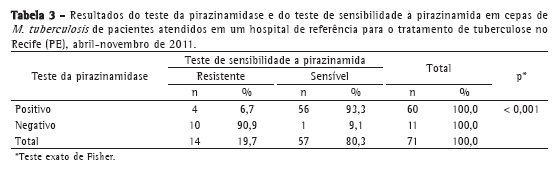Objetivo: Verificar a resistência primária e adquirida à pirazinamida em cepas de Mycobacterium tuberculosis provenientes de amostras de escarro de pacientes com tuberculose pulmonar. Métodos: Estudo prospectivo e descritivo realizado no período entre abril e novembro de 2011 em um hospital de referência para o tratamento de tuberculose em Recife (PE). Culturas, testes de sensibilidade a fármacos e testes da pirazinamidase foram realizados em um laboratório particular na mesma cidade. Resultados: Dos 71 pacientes incluídos no estudo, 37 eram virgens de tratamento e 34 eram casos de retratamento. Desses, 0 (0,0%) e 14 (41,2%), respectivamente, apresentaram cepas resistentes à pirazinamida. Desses 14 isolados, 10 (90,9%) apresentaram resultados negativos no teste da pirazinamidase. Dos 60 isolados que apresentaram resultados positivos para o teste da pirazinamidase, 56 (93,3%) eram sensíveis à pirazinamida. Conclusões: A elevada frequência de cepas resistentes à pirazinamida em pacientes em retratamento da tuberculose destaca a necessidade da realização de testes de sensibilidade à pirazinamida antes de se escolher um novo esquema de tratamento.