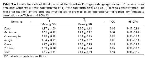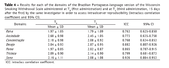 In conclusion, the present study showed that it is possible to translate and culturally adapt an instrument originally developed in a foreign language, the translated version showing excellent reproducibility. All of the domains of the Brazilian Portuguese-language version of the WSWS showed excellent intraobserver and interobserver reproducibility. The Brazilian Portuguese-language version of the WSWS is reproducible and easy to use. It can therefore be used as a tool for assessing the severity of the symptoms of nicotine withdrawal in the Brazilian population.