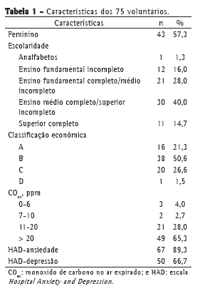 Para a reprodutibilidade, foram avaliados 76 voluntários fumantes que procuraram o PREVFUMO. Apenas 1 voluntário não foi incluído na pesquisa por apresentar escore menor que 21 pontos ao MEM. Dos 75 voluntários incluídos, a maioria era do gênero feminino, possuía pelo menos o ensino médio completo e pertenciam à classe econômica A ou B (Tabela 1).