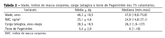 A média de idade dos voluntários foi de 46,3 ± 10,5 anos. O índice de massa corpórea caracterizou a população estudada como tendo sobrepeso mas muito próximo dos valores de normalidade. A média da carga tabágica dos participantes foi de 28,5 ± 18,5 anos-maço, com baixa dependência à nicotina (Tabela 2).