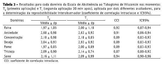 No primeiro dia da avaliação do fumante no PREVFUMO (T0), a tradução final da WSWS foi respondida, concomitantemente ao teste de Fagerström,(16) escala hospital anxiety and depression (HAD)(17) e mensuração dos níveis de COex.(18,19) No mesmo dia, a WSWS foi aplicada pela segunda vez (T1), 30 min após T0, por um pesquisador diferente, com o objetivo de avaliar a reprodutibilidade interobservador. Quinze dias após T0, quando os voluntários ainda não haviam iniciado o tratamento para a cessação do tabagismo, a escala foi aplicada pela terceira vez (T2) pelo mesmo pesquisador da primeira avaliação para avaliar a reprodutibilidade intraobservador. O início da terapia para cessação não foi informado aos voluntários, visando minimizar sintomas de ansiedade e/ou depressão.
