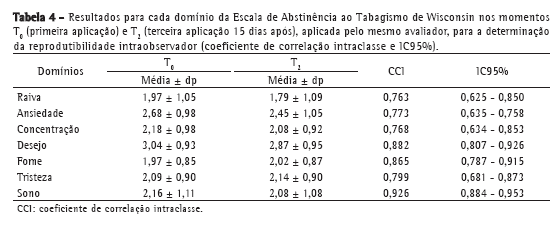 Em conclusão, a presente pesquisa demonstrou a viabilidade da tradução e adaptação cultural, com excelente reprodutibilidade de um questionário de origem em língua estrangeira. Obteve-se excelente reprodutibilidade intra e interobservador em todos os domínios da Escala de Abstinência ao Tabagismo de Wisconsin. Assim, a versão para o português falado no Brasil da WSWS é reprodutível e de fácil aplicação, podendo ser utilizada para a avaliação dos sintomas da síndrome de abstinência à nicotina, no período pós-cessação do tabagismo, na população brasileira.