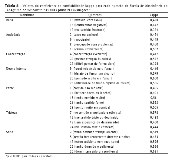 O coeficiente de confiabilidade kappa foi utilizado para avaliar a reprodutibilidade questão a questão da WSWS. A maioria das questões apresentou nível de concordância de moderado a bom, sendo o coeficiente menor que 0,4 apenas nas questões 18 e 27 (Tabela 5).