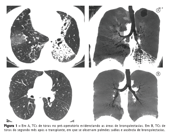 Há 13 anos atendemos uma paciente de 26 anos, portadora de síndrome de Kartagener com história de pneumonia de repetição e bronquiectasias localizadas, refratárias ao tratamento clínico. Estavam indicadas a lobectomia média (à esquerda) e lingulectomia (à direita). A paciente permaneceu assintomática durante 10 anos até o recrudescimento das pneumonias devido a novos focos bronquiectásicos (Figura 1), tendo evoluído com importante comprometimento da função pulmonar, o que demandou o uso contínuo de oxigenoterapia a 7 L/min.