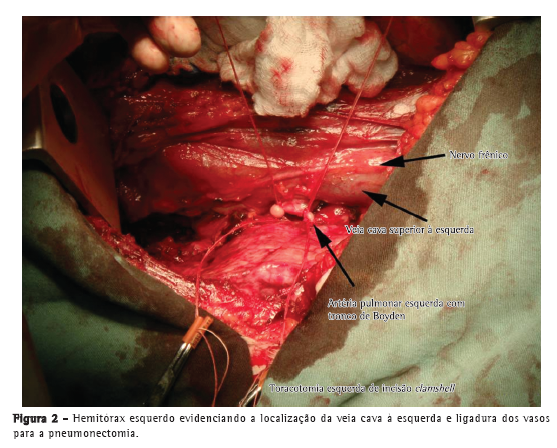 O procedimento foi realizado através de toracoesternotomia transversa bilateral (clamshell) e, devido à dextrocardia, as veias cavas superior e inferior estavam à esquerda (Figura 2). Iniciamos pela lise das aderências e prosseguimos com a dissecção do hilo pulmonar à esquerda seguindo com a pneumonectomia (perfusão de 21%). Não houve instabilidade hemodinâmica ou dessaturação após o clampeamento da artéria pulmonar, com boa tolerância à ventilação monopulmonar, prescindindo do uso de circulação extracorpórea (CEC).