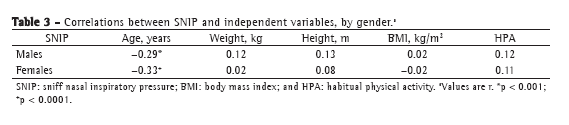 Several studies have mentioned the importance of SNIP as a valid, non-invasive, easy-to-apply test of inspiratory muscle strength, as well as a complement to MIP.(5,6) This is the third study in the literature to propose reference values for SNIP in healthy adults and the first to do so for the Brazilian population. The results of the present study show that SNIP was significantly lower in females than in males, a finding that is likely due to the greater muscle mass of the latter, corroborating the findings of other studies investigating respiratory muscle strength.(11,21,22) In terms of SNIP values, we found significant differences between age brackets (within each gender) and a decrease with age. This might be attributed to the reduction in inspiratory muscle strength during the aging process, resulting from sarcopenia; the loss of muscle mass(22-24); and the loss of viscoelasticity of the lungs and rib cage,(23) associated with an increase in abdominal fat, which can interfere with the biomechanics of the diaphragm.(11) Among the independent variables (age, weight, height, BMI, and HPA), only age correlated with SNIP (a weak negative correlation), which is in agreement with the findings of Uldry  Fitting(6) and, for males only, of Kamide et al.(9) Uldry  Fitting(6) also found that weight and BMI did not correlate with SNIP. Although respiratory muscle strength is directly related to the level of physical activity,(11) HPA showed no correlation with SNIP in either males or females. It should be borne in mind that Baecke's questionnaire provides only an index, which precludes characterizing the level of physical activity, thereby making it difficult to identify sedentary lifestyles.(25) The SNIP reference values obtained in the present study differed from those reported for healthy Japanese males and females (76.8 ± 28.9 cmH2O and 60 ± 20 cmH2O, respectively). Our linear regression analysis demonstrated that predictive equations resulted from SNIP as a function of age, for both genders, which is in keeping with the findings of Uldry  Fitting(6) and Kamide et al.,(9) except that the latter group of authors found that, in females, SNIP correlated only with BMI. This is in contrast with the reported negative influence of age on respiratory muscle strength,(21-23) as well as with the positive relationship between respiratory muscle mass and lean mass, which is more evident in males.(11,21) One important aspect of our results is that the coefficient of determination for age in the linear regression model was low, for males and females (R2 = 0.09 and R2 = 0.1, respectively), although that finding is also analogous to those of Uldry  Fitting (R2 = 0.09 and R2 = 0.05, respectively) and of Kamide et al. (R2 = 0.14 for males).(6,9) According to the ATS,(21) the wide variability in reference values is due to methodological differences that can influence the assessment of lung function, including the measurement technique, as well as individual, biological, and population aspects. In this context, we should highlight a number of differences between the present study and those conducted by Uldry  Fitting(6) and Kamide et al.(9) Our investigation adhered to the recommendations of the ATS(21) and was based on methodologies of earlier studies designed to obtain reference equations for lung function(14,18) and muscle function.(6,11,19) Another factor to consider is that there can be ethnic and individual differences within a given population. In comparison with the populations of European countries and of Japan, the Brazilian population is ethnically heterogeneous. Reference values should be based on recent data, and the most recent predictive equations for SNIP were published in 1995 and 2009.(6,9) Sociodemographic and environmental changes likely influence the results, which should therefore be updated periodically. As such, the differences observed might be attributed to differences in technical assessment, equipment, and population characteristics.