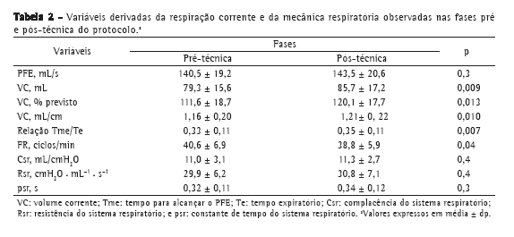 Todas as variáveis contínuas analisadas apresentaram distribuição normal, foram avaliadas pelo teste de Shapiro-Wilk e, portanto, estão apresentadas em média e desvio-padrão. A média dos 60 s de avaliação do VC e das três medidas da mecânica respiratória foi utilizada para a comparação pré e pós-técnica. Foi utilizado o teste t de Student para amostras dependentes para a análise das variáveis da respiração corrente (VC e FR) e de mecânica respiratória (Csr, Rsr e psr) entre as fases pré-técnica e pós-técnica. Fixou-se em 5% o nível de rejeição para a hipótese nula. O programa utilizado para a análise foi o Statistical Package for the Social Sciences, versão 14.0 (SPSS Inc., Chicago, IL, EUA).