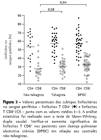 Em 1995, alguns autores(11) postularam que as pessoas que desenvolveriam a DPOC seriam aquelas que já apresentavam diminuição fenotípica de células CD4+ ou aumento fenotípico das células CD8+ no sangue. Desta forma, as alterações linfocitárias do sangue poderiam estar envolvidas no mecanismo fisiopatogênico da DPOC, fato que ainda não está confirmado pela literatura.(6)