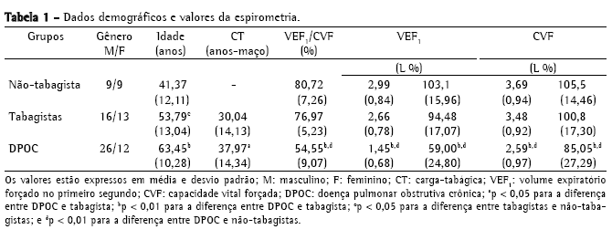 O projeto foi aprovado pelo Comitê de Ética em Pesquisa do Hospital Universitário Clementino Fraga Filho, da Universidade Federal do Rio de Janeiro, e todos os indivíduos do estudo assinaram Termo de Consentimento Livre e Esclarecido. Foram avaliadas 85 pessoas, sendo 38 pacientes com DPOC, 29 tabagistas e 18 não-tabagistas sem obstrução ao fluxo aéreo. O diagnóstico de DPOC foi feito com base nos critérios do Global Initiative for Chronic Obstructive Lung Disease (GOLD),(1) sendo 3 definidos como leves, 18 como moderados e 17 como graves.