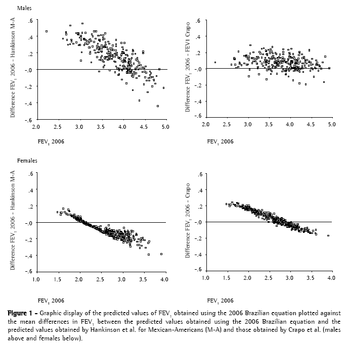 The mean differences between the Brazilian predicted values obtained in 2006 and those suggested by the various authors were compared. Graphs were generated in order to determine greater or smaller differences as the Brazilian predicted values increased or decreased.