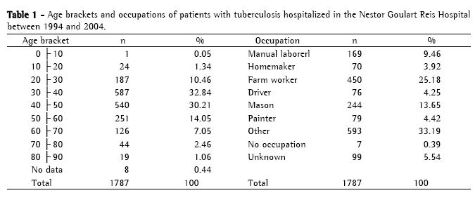 Objective: To describe the demographic and clinical characteristics of patients with tuberculosis hospitalized in the Nestor Goulart Reis Hospital, located in the city of Américo Brasiliense, Brazil. Methods: Epidemiological investigation by means of an observational, retrospective, descriptive study based on the medical charts of patients diagnosed with tuberculosis and hospitalized between 1994 and 2004. Results: There were 1787 patients diagnosed with tuberculosis during the period evaluated. Of those, 117 (7%) were females, 1670 (93%) were males; 1215 (68%) were single, separated or widowed. Most of the patients (74%) had not completed middle school, and most (63%) were between 30 and 50 years of age. In addition, 61% suffered from alcoholism. The most common occupation was farm worker (25% of the patients), and 70% of the patients were unemployed. The most common clinical form of the disease was the pulmonary form (in 92%). The rate of medical discharge was 60%. The treatment regimen differed from the standard (rifampin, isoniazid and pyrazinamide) in 34% of the cases. Conclusions: The profile of the patients with tuberculosis hospitalized in the hospital studied showed that they had special requirements: they were unable to take care of themselves (social cases) and required alternative treatment regimens, which justified their hospitalization. This hospital played an important social role in the treatment and guidance of these patients.