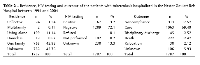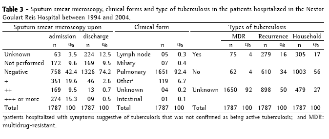 Still analyzing Table 3, we must highlight the distinction between readmission and recurrence in our study. Of the 1969 patients hospitalized during the study period, 182 cases of readmission of frequent patients were excluded, and we took into consideration only their first readmission during the study period. Recurrence was defined in those cases in which prior tuberculosis episodes had been reported in the medical charts, when patients were either treated in outpatient clinics or hospitalized in other institutions or in the HNGR itself prior to the study period. Unfortunately, the study of this variable was impaired, since this information stopped being registered in the medical charts, which resulted in the variable being recorded as 'unknown' for 50% of the cases. Nevertheless, the rates of recurrence (15%) and readmission (9.24%) due to treatment noncompliance or reinfection in those patients who were medically discharged suggest that the success in the control of the disease could be improved, considering that some individuals may have an inherent predisposition to recurrent episodes of tuberculosis.(11) Of the 1787 patients, 119 (6.7%) were hospitalized due to symptoms suggestive of tuberculosis, although active tuberculosis was not confirmed. These cases revealed sequelae caused by previous tuberculosis or by pulmonary infections other than tuberculosis.