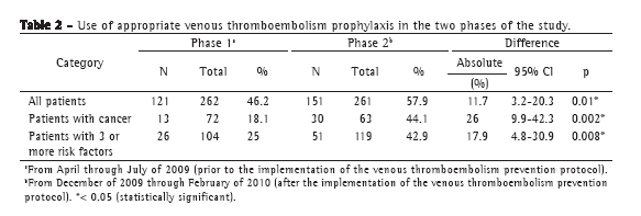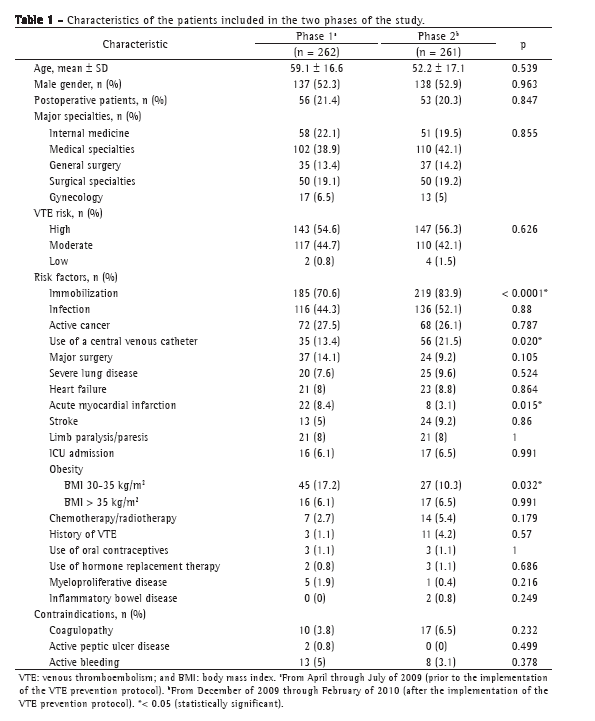 In the first phase of the study, conducted between April and July of 2009 (prior to the implementation of the VTE prevention protocol), the patient sample comprised 262 patients, whereas that of the second phase of the study, conducted between December of 2009 and February of 2010 (after the implementation of the protocol), comprised 261 patients. In both phases, the data were collected by six residents in internal medicine, previously trained in the appropriate techniques, who reviewed patient charts and prescription forms in order to obtain the pertinent data. No attending physicians were informed of the study.