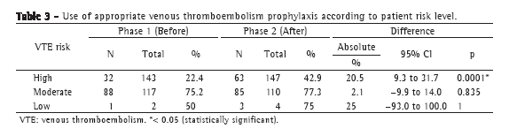 The main outcome measure was an increase in the proportion of patients receiving appropriate VTE prophylaxis, comparing the pre-implementation and post-implementation periods. In both phases, patients were randomly selected from among those admitted to the medical or surgical wards, including the ICU. Randomization was performed by drawing bed numbers, with the number of beds used in each specialty proportional to the ratio between the number of beds available to that specialty and the total number of beds in the hospital. The inclusion criteria were being over 18 years of age and having been hospitalized for ≥ 48 h on any of the wards. The exclusion criteria were current anticoagulation, pregnancy, puerperium, and a history of acute thromboembolic disease.