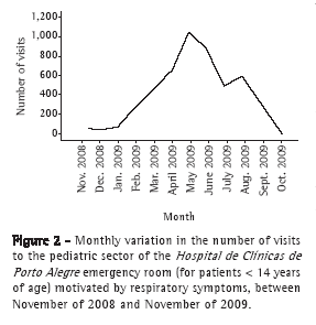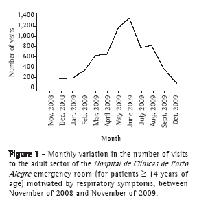 Children and adults who presented to the emergency room with at least one respiratory symptom were included in the study. During the study period (between November of 2008 and November of 2009), we reviewed the total number of visits per day to the pediatric and adult sections of the emergency room of the HCPA. The electronic medical records were reviewed, and the characteristics of the patients treated for respiratory symptoms that were recorded included gender, age, race, smoking history, comorbidities, respiratory symptoms, and familial history of flu symptoms. The respiratory symptoms considered were rhinorrhea, nasal congestion, odynophagia, dysphonia, cough, breathlessness, wheezing, chest pain, and fever. The patients who presented with fever alone were not included in the study. Clinical findings on admission (axillary temperature, HR, RR, pulmonary auscultation findings, and SpO2-measured by digital pulse oximetry) were also recorded, as were the major clinical syndromes diagnosed and the patient outcomes (ICU admission, ward admission, discharge from the emergency room, and death).