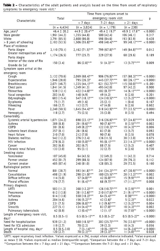 Table 2 shows the characteristics of the adult patients and the analysis of these characteristics on the basis of the time from symptom onset to emergency room visit. Because data on the time from symptom onset to emergency room visit were not available for all patients, the analysis included only 4,434 patients. Of those 4,434 patients, 939 (21.2%) were admitted to the hospital and 120 (2.7%) died. The median (interquartile range) length of emergency room visit and the median (interquartile range) total length of hospital stay were 0.5 day (0.5-1.0 day) and 0.5 day (0.5-3.0 days), respectively. The patients who had a 6-day or shorter history of respiratory symptoms (<7 group) were younger than those who had a 7- to 21-day history (7-21 group) and those who had a 21-day or longer history (>21 group; 44.9 ± 20.4 years vs. 49.4 ± 19.7 years and 49.9 ± 17.6 years; p < 0.0001). A longer time from symptom onset to emergency room visit correlated with a lower level of education of the patients (p < 0.0001). When the proportion of patients who were residents of the city of Porto Alegre was higher, the time from symptom onset to emergency room visit was shorter (p = 0.012). Rhinorrhea, odynophagia, and fever were most common in the patients in the <7 group, whereas cough and breathlessness were most common in those in the 7-21 group. The number of patients with asthma was highest in the <7 group (p = 0.002), and the number of patients with HIV infection was highest in the >21 group (p < 0.0001). Among the patients who underwent chest X-ray, normal results were more common in those in the <7 group (p < 0.0001), and a consolidation pattern was more common in those in the 7-21 group (p = 0.002). Pleural effusion and diffuse infiltrates were most common in the >21 group (p = 0.008 and p = 0.003, respectively). The most common diagnoses in the <7 group were influenza (in 18.2%), pneumonia (in 12.6%), and URTI (in 12.2%). In the 7-21 group, the most common diagnoses were pneumonia (in 17.8%), URTI (in 10.7%), and COPD exacerbation (in 9.6%); whereas the most common diagnoses in the >21 group were pneumonia (in 9.1%), COPD exacerbation (in 5.2%), and sinusitis (in 4.3%). The length of emergency room visit was shortest among the patients in the <7 group (p < 0.0001). A longer time from symptom onset to emergency room visit correlated with a greater need for hospitalization (p < 0.0001), longer hospital stays (p < 0.0001), and higher mortality (p = 0.028).