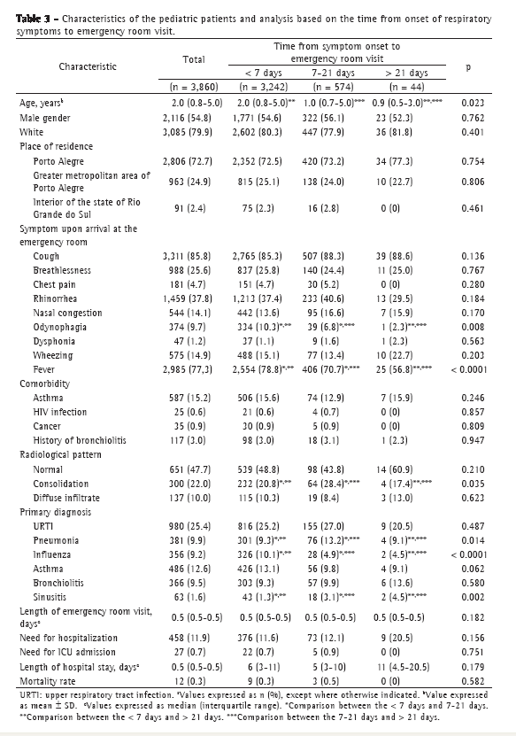 The present study has some methodological limitations. We included only patients presenting to the emergency room, and those probably represented cases that were more severe than those treated in primary care. In addition, the diagnoses were syndromic (i.e., the etiologic agent was not identified). However, despite these limitations, the study achieved its objective of showing the characteristics of patients with respiratory symptoms and is relevant for the evaluation of these patients in the context of emergency care.