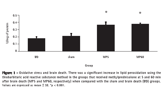 To our knowledge, the present study is the first to investigate the role of the administration of methylprednisolone in a rat model of brain death and its influence on TNF- expression and oxidative stress in the lungs.(22)