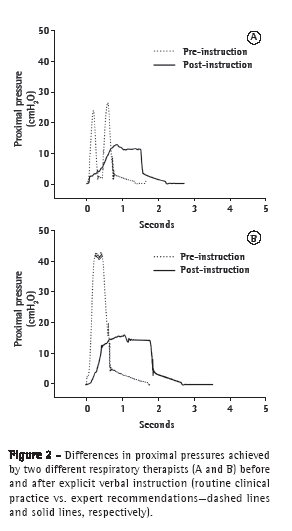 In conclusion, when asked to apply MH in accordance with their routine clinical practice, this small sample of RTs performed the maneuver quite differently from what is recommended by experts, producing a concerning pattern of ventilation in terms of secretion clearance. The repetition of the maneuver after explicit instructions reduced the Pprox but did not help much. Alveolar pressures were usually low (because of the small generated VT) despite high proximal pressures and high inspiratory peak flows. As a result, PEF was also low, far lower than the preceding PIF, a condition theoretically impacting the secretions deeper into the lung. Further studies are necessary in this area, especially focusing on the use of flow-inflating devices delivering higher tidal volumes.