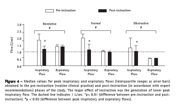 Comparing all three clinical scenarios tested and the two phases of the study, we found that Pprox was markedly higher than was Palv in all instances, with the exception of the restrictive lung disease scenario in the post-instruction phase (Figure 3). In the pre-instruction phase, PIF values were consistently higher than were PEF values. In the post-instruction phase, the PIF/PEF ratio was closer to 1:1. The only situation in which that ratio was consistently unfavorable (PIF still far exceeding PEF) was the obstructive lung disease scenario (Figure 4).