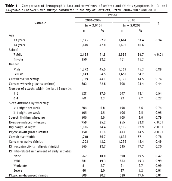 In conclusion, the results of our second survey, conducted in 2010, confirm the high prevalences of asthma, rhinitis, and symptoms previously observed in this age group, revealing an increase in the frequency of exercise-induced wheezing and dry cough at night. Underdiagnosis of asthma and rhinitis remains evident, although there was an increase in the frequency of physician-diagnosed asthma and a reduction in the frequency of severe rhinitis. In addition, the present study confirms the predominance of females and private school students among the adolescents reporting symptoms of these diseases. Finally, the present study shows, for the first time, a comparison of the prevalences of asthma and rhinitis between two different periods in the city of Fortaleza, reporting current and relevant data that serve to alert health administrators and planners of the essential need to invest in the quality of primary care focused on the prevention and control of these diseases.
