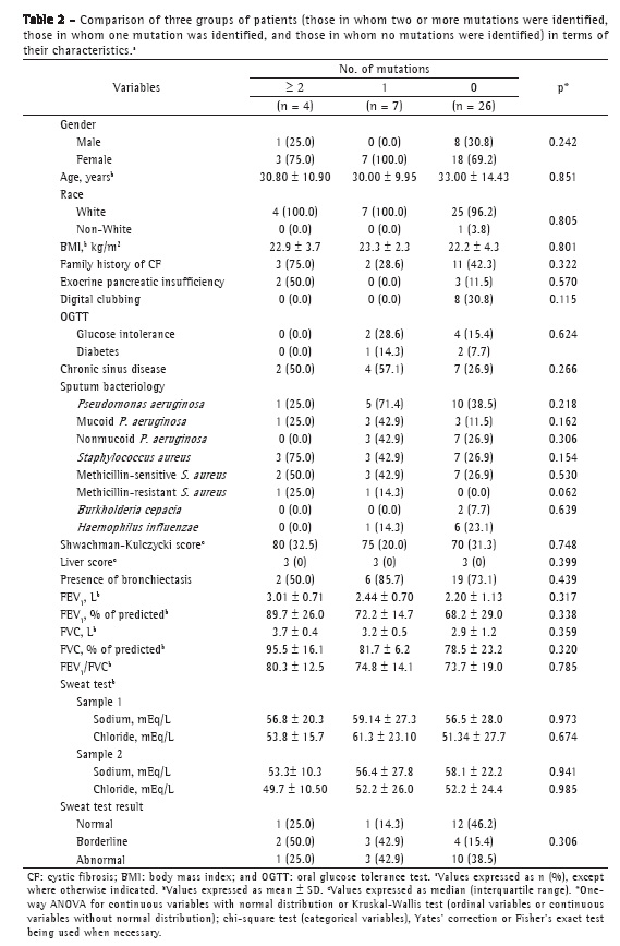 Table 2 compares the three groups of patients (those in whom two or more mutations were identified, those in whom only one mutation was identified, and those in whom no mutations were identified) in terms of their characteristics. There were no significant differences among the groups regarding gender, age, race, or family history of CF. There were no significant differences among the three groups regarding exocrine pancreatic insufficiency, which was found in 2, zero, and 3 patients, respectively. There were also no significant differences among the groups regarding presence of digital clubbing, BMI, presence of diabetes mellitus, or presence of chronic sinus disease. Regarding sputum microbiology, we found no significant differences among the groups in terms of the identification of P. aeruginosa, S. aureus, H. influenzae, and B. cepacia. There were no significant differences among the groups regarding the Shwachman-Kulczycki score, the Williams liver score, or the presence of bronchiectasis. There were also no statistically significant differences among the three groups regarding the mean FVC and FEV1, in % of predicted, or the mean FEV1/FVC ratio. There were no differences among the groups in terms of sweat sodium and chloride concentrations. There were no differences among the three groups regarding normal, borderline, or abnormal sweat test results. Those results were observed, respectively, in 1, 2, and 1 of the patients in whom at least two mutations were identified; in 1, 3, and 3 of the patients in whom one mutation was identified; and in 12, 4, and 10 of the patients in whom no mutations were identified.