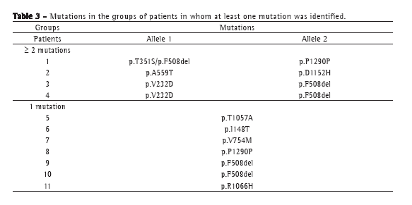 Molecular analysis was performed in the HCPA Department of Genetics. A sample of 5 mL of peripheral blood was collected for DNA extraction. The CFTR gene coding region was amplified by polymerase chain reaction. Sequencing of the fragments was performed using the Big DyeT Terminator v3.1 Ready Reaction Cycle Sequencing (Applied Biosystems, Foster City, CA, USA) and fluorescent dye terminator sequencing on a genetic analyzer (ABI PRISMT 3130xl, Applied Biosystems). The analyses were performed with the DNA Sequencing Software v5.2 (Applied Biosystems). All 27 CFTR gene exons were sequenced. The flanking regions and exon-intron organization were also included in the sequencing. The intron 8 polymorphism was also analyzed.