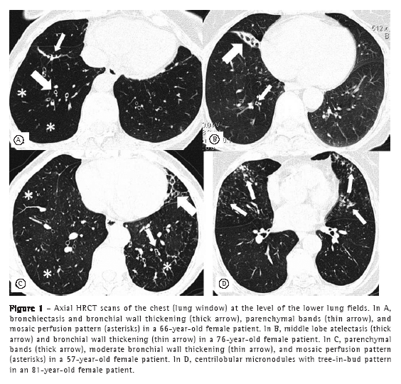 In our analysis of HRCT scans, we used the criteria established by the Brazilian Thoracic Association illustrated Brazilian consensus of terms and fundamental patterns in chest CT scans.(23) In order to locate abnormalities, we used the following criteria: upper lung fields-from the apices to the carina; middle lung fields-from the carina to the mitral valve; and lower lung fields-from the mitral valve to the lung bases. The degree of pulmonary impairment was determined on the basis of the number of lung lobes showing the following changes: parenchymal bands; mosaic perfusion pattern; atelectasis; tree-in-bud pattern; and traction bronchiectasis. The degree of bronchial wall thickening was classified as follows: grade 1-up to 20% of the diameter of the adjacent pulmonary artery; grade 2-greater than 20% and less than 50% of the diameter of the adjacent pulmonary artery; and grade 3-50-100% of the diameter of the adjacent pulmonary artery. Bronchiectasis was graded as follows: grade 1-the ratio between the internal diameter of the bronchus and the diameter of the adjacent artery was 0.7-1.0; grade 2-the internal diameter of the bronchus was increased but was less than twice the diameter of the adjacent artery; and grade 3-the internal diameter of the bronchus was more than twice the diameter of the adjacent artery. Centrilobular emphysema was classified as follows(24,25): absent; areas of < 5 mm; areas > 5 mm; diffuse areas of low attenuation that were not interspersed with areas of normal lung; and large, confluent areas of low attenuation.