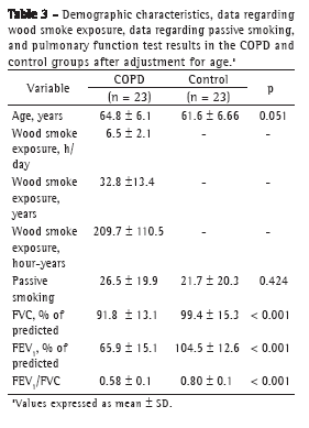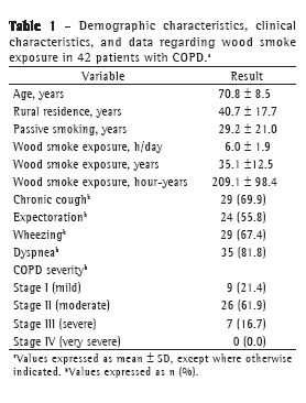 MethodsThe present study was conducted in central Brazil between 2008 and 2011. The inclusion criteria for COPD patients were as follows: being ≥ 40 years of age; having been exposed to wood smoke ≥ 80 hour-years for at least 10 years; not being a smoker; and having received a clinical and spirometric diagnosis of COPD. The inclusion criteria for controls were as follows: being ≥ 40 years of age; living in an urban area; not being a smoker; having no history of wood smoke exposure; and having normal spirometry results. All of the females who participated in the present study gave written informed consent. The exclusion criteria for COPD patients and controls were as follows: presenting with clinical findings (of an evaluation performed by a pulmonologist in the present study or of a previous evaluation by a pulmonologist, as reported in the medical records) suggestive of a history of asthma, rhinitis, or any extrapulmonary disease that might affect lung function; and having a positive bronchodilator test, FEV1 increasing by ≥ 12% and 200 mL.(15)