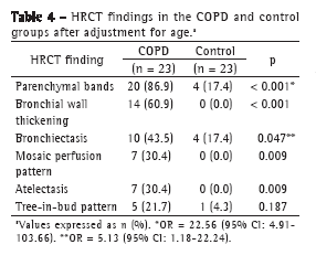 After age matching, parenchymal bands, bronchial wall thickening, bronchiectasis, mosaic perfusion pattern, and laminar atelectasis were found to be significantly more common in the COPD group than in the control group. As can be seen in Table 4, those abnormalities occurred predominantly in the lower lung fields (in 76.6%), having occurred in the middle lung fields in 15.6% and in the upper lung fields in 7.8%.