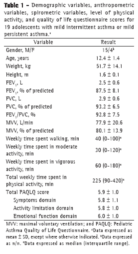 Table 1 shows the following: demographic, anthropometric, and spirometric data at baseline; the level of physical activity, as determined by the time (in min) spent walking, the time (in min) spent in moderate activity, the time (in min) spent in vigorous activity, and the total time spent in physical activity in the previous week; the scores for each PAQLQ domain; and the total PAQLQ scores. The level of physical activity in the study sample was determined on the basis of the answers to the IPAQ.(15) Of the 19 participants, 7 were classified as insufficiently active, 7 were classified as active, and 5 were classified as very active.